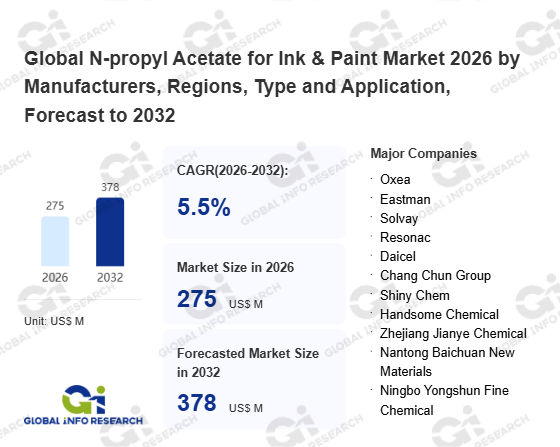 Global Info Research has recently published "Global N-propyl Acetate for Ink & Paint Market 2026 by Manufacturers, Regions, Type and Application, Forecast to 2032". This report systematically analyzes the current status, future trends (2021-2032), and competitive landscape of the global N-propyl Acetate for Ink & Paint market. It provides a quantitative analysis from the perspectives of type (Purity≥99%、 Purity≥99.7%), application (Ink Industry、 Paint Industry), regional markets, and major manufacturers (Oxea、 Eastman、 Solvay、 Resonac、 Daicel、 Chang Chun Group、 Shiny Chem、 Handsome Chemical、 Zhejiang Jianye Chemical、 Nantong Baichuan New Materials、 Ningbo Yongshun Fine Chemical、 Jiangsu Ruijia Food Additive、 Nalcohol Chemical、 Ruibai Group), comprehensively assessing market opportunities and competitive dynamics.