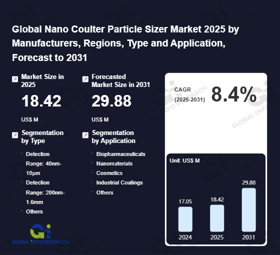 Global Info Research has recently published "Global Nano Coulter Particle Sizer Market 2026 by Manufacturers, Regions, Type and Application, Forecast to 2032". This report systematically analyzes the current status, future trends (2021-2032), and competitive landscape of the global Nano Coulter Particle Sizer market. It provides a quantitative analysis from the perspectives of type (Detection Range: 40nm-10µm、 Detection Range: 200nm-1.6mm、 Others), application (Biopharmaceuticals、 Nanomaterials、 Cosmetics、 Industrial Coatings、 Others), regional markets, and major manufacturers (Spectradyne、 Beckman Coulter、 Izon Science、 Malvern Panalytical、 Nanofcm、 Resun Technology), comprehensively assessing market opportunities and competitive dynamics.