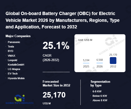 Global Info Research has recently published "Global On-board Battery Charger (OBC) for Electric Vehicle Market 2026 by Manufacturers, Regions, Type and Application, Forecast to 2032". This report systematically analyzes the current status, future trends (2021-2032), and competitive landscape of the global On-board Battery Charger (OBC) for Electric Vehicle market. It provides a quantitative analysis from the perspectives of type (6-8 KW、 Below 6 KW、 Above 8 KW), application (BEV、 PHEV), regional markets, and major manufacturers (Panasonic、 Tesla、 BYD、 VMAX、 Leopold KostalbGmbH、 LG Magna、 EV-Tech、 Hyunda Mobis、 Shinry、 Tiecheng、 Enpower、 Toyota Industries、 Valeo), comprehensively assessing market opportunities and competitive dynamics.
