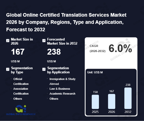 Global Info Research has recently published "Global Online Certified Translation Services Market 2026 by Manufacturers, Regions, Type and Application, Forecast to 2032". This report systematically analyzes the current status, future trends (2021-2032), and competitive landscape of the global Online Certified Translation Services market. It provides a quantitative analysis from the perspectives of type (Official Certification、 Association Certification、 Others), application (Immigration & Study Abroad、 Law & Business、 Academic Research、 Others), regional markets, and major manufacturers (RushTranslate、 Day Translations、 Tomedes、 GTS Translation、 Certified Translation Services、 Translayte、 London Translations、 lingoking、 Translate Fast Ltd、 TheWordPoint、 Native Translator、 CS Translation、 Kwintessential、 Mars Translation、 Atlas Translations、 First Edition Translations、 Absolute Translations、 Rosetta Translation、 Language Reach), comprehensively assessing market opportunities and competitive dynamics.