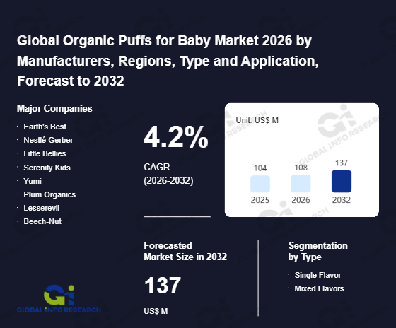 Global Info Research has recently published "Global Organic Puffs for Baby Market 2026 by Manufacturers, Regions, Type and Application, Forecast to 2032". This report systematically analyzes the current status, future trends (2021-2032), and competitive landscape of the global Organic Puffs for Baby market. It provides a quantitative analysis from the perspectives of type (Single Flavor、 Mixed Flavors), application (0-6 Months、 6-12 Months、 12+ Months), regional markets, and major manufacturers (Earth's Best、 Nestlé Gerber、 Little Bellies、 Serenity Kids、 Yumi、 Plum Organics、 Lesserevil、 Beech-Nut、 Little Spoon、 PuffWorks、 Sprout、 Kabrita、 Ella's Kitchen、 Mission MightyMe、 Organix、 Little Blossom、 Happy Family Organics), comprehensively assessing market opportunities and competitive dynamics.