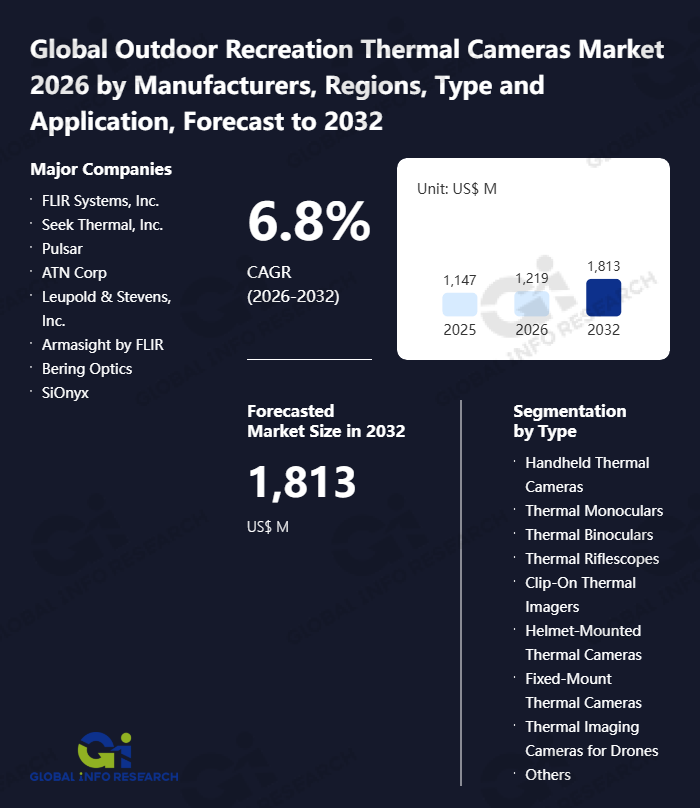 Global Info Research has recently published "Global Outdoor Recreation Thermal Cameras Market 2026 by Manufacturers, Regions, Type and Application, Forecast to 2032". This report systematically analyzes the current status, future trends (2021-2032), and competitive landscape of the global Outdoor Recreation Thermal Cameras market. It provides a quantitative analysis from the perspectives of type (Handheld Thermal Cameras、 Thermal Monoculars、 Thermal Binoculars、 Thermal Riflescopes、 Clip-On Thermal Imagers、 Helmet-Mounted Thermal Cameras、 Fixed-Mount Thermal Cameras、 Thermal Imaging Cameras for Drones、 Others), application (Online、 Offline), regional markets, and major manufacturers (FLIR Systems, Inc.、 Seek Thermal, Inc.、 Pulsar、 ATN Corp、 Leupold & Stevens, Inc.、 Armasight by FLIR、 Bering Optics、 SiOnyx、 Hikvision、 Boson (a FLIR company)), comprehensively assessing market opportunities and competitive dynamics.