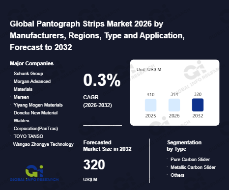 Global Info Research has recently published "Global Pantograph Strips Market 2026 by Manufacturers, Regions, Type and Application, Forecast to 2032". This report systematically analyzes the global Pantograph Strips market, providing multi-dimensional insights through type (Pure Carbon Slider、 Metallic Carbon Slider、 Others), application (Electric Locomotive、 EMU、 Subway/Light Rail), regional markets, and major manufacturers (Schunk Group、 Morgan Advanced Materials、 Mersen、 Yiyang Mogen Materials、 Doneka New Material、 Wabtec Corporation(PanTrac)、 TOYO TANSO、 Wangao Zhongye Technology、 Hongde Electrical Carbon Products、 Kimwan Carbon), assessing the market status, trend evolution, and competitive landscape impact from 2021 to 2032.