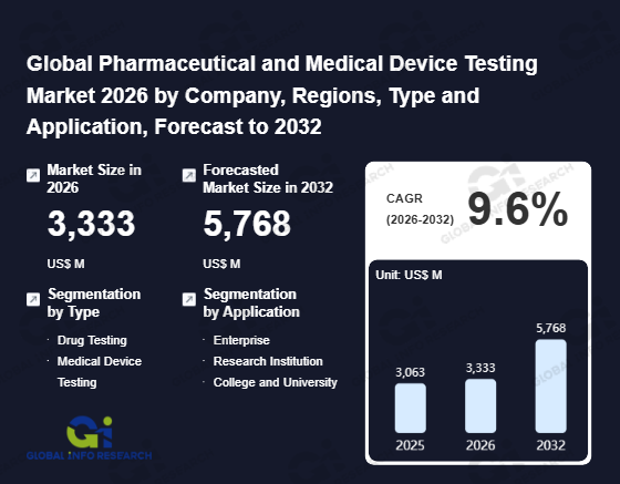 Global Info Research has recently published "Global Pharmaceutical and Medical Device Testing Market 2026 by Manufacturers, Regions, Type and Application, Forecast to 2032". This report systematically analyzes the global Pharmaceutical and Medical Device Testing market, providing multi-dimensional insights through type (Drug Testing、 Medical Device Testing), application (Enterprise、 Research Institution、 College and University), regional markets, and major manufacturers (SGS、 Shimadzu、 Charles River Laboratories、 Eurofins、 RCTS、 Nelson Laboratories、 DeviceLab、 EAG Laboratories、 EdgeOne Medical、 Element、 NAMSA、 Pace Labs、 Intertek、 Associates of Cape Cod (ACC)、 Tentamus、 EKG Labs、 MycoScience、 GDMDT、 Guangdong Lewwin、 GTTC、 PONY、 Guangzhou Guobiao、 CAS Testing Technical Services、 Guangzhou General Pharmaceutical Research Institute、 Guangdong Huawei Testing、 Shanghai Ingeer、 CIRS、 Shanghai Fuda), assessing the market status, trend evolution, and competitive landscape impact from 2021 to 2032.
