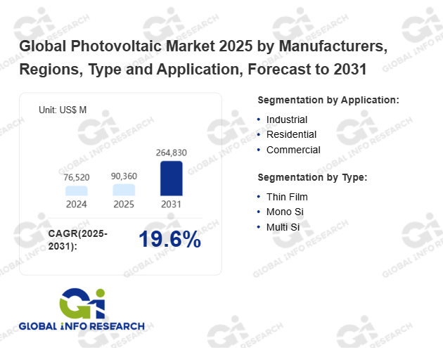 Global Info Research has recently published "Global Photovoltaic Market 2026 by Manufacturers, Regions, Type and Application, Forecast to 2032". This report systematically analyzes the current status, future trends (2021-2032), and competitive landscape of the global Photovoltaic market. It provides a quantitative analysis from the perspectives of type (Thin Film、 Mono Si、 Multi Si), application (Industrial、 Residential、 Commercial), regional markets, and major manufacturers (Kaneka、 Kyocera、 Mitsubishi Electric、 Panasonic、 Sharp、 Ja Solar、 Jinko Solar、 Renesola、 Suntech Power、 Trina Solar、 Yingli Solar、 Canadian Solar), comprehensively assessing market opportunities and competitive dynamics.