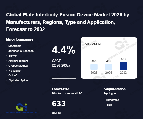 Global Info Research has recently published "Global Plate Interbody Fusion Device Market 2026 by Manufacturers, Regions, Type and Application, Forecast to 2032". This report systematically analyzes the current status, future trends (2021-2032), and competitive landscape of the global Plate Interbody Fusion Device market. It provides a quantitative analysis from the perspectives of type (Integrated、 Split), application (Hospital、 Clinic、 Others), regional markets, and major manufacturers (Medtronic、 Johnson & Johnson、 Stryker、 Zimmer Biomet、 Globus Medical、 NuVasive、 Orthofix、 Alphatec Spine、 SeaSpine、 B. Braun Aesculap、 Ulrich Medical、 SIGNUS Medizintechnik), comprehensively assessing market opportunities and competitive dynamics.