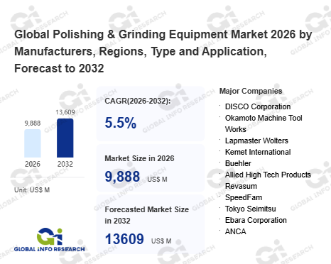 Global Info Research has recently published "Global Polishing & Grinding Equipment Market 2026 by Manufacturers, Regions, Type and Application, Forecast to 2032". This report systematically analyzes the global Polishing & Grinding Equipment market, providing multi-dimensional insights through type (Grinding Equipment、 Lapping Equipment、 Polishing Equipment、 CMP Equipment、 Others), application (Semiconductor Manufacturing、 Optics & Optoelectronics、 Mold & Tooling、 Metal & Ceramic Processing、 Glass & New Materials、 Others), regional markets, and major manufacturers (DISCO Corporation、 Okamoto Machine Tool Works、 Lapmaster Wolters、 Kemet International、 Buehler、 Allied High Tech Products、 Revasum、 SpeedFam、 Tokyo Seimitsu、 Ebara Corporation、 ANCA、 United Grinding Group、 JUNKER Group、 TSCHUDIN、 Kuroda Seiko、 DISKUS WERKE、 Fives Group、 Supfina、 NAGEL、 Strausak、 Kehren、 Toyoda Van Moppes), assessing the market status, trend evolution, and competitive landscape impact from 2021 to 2032.