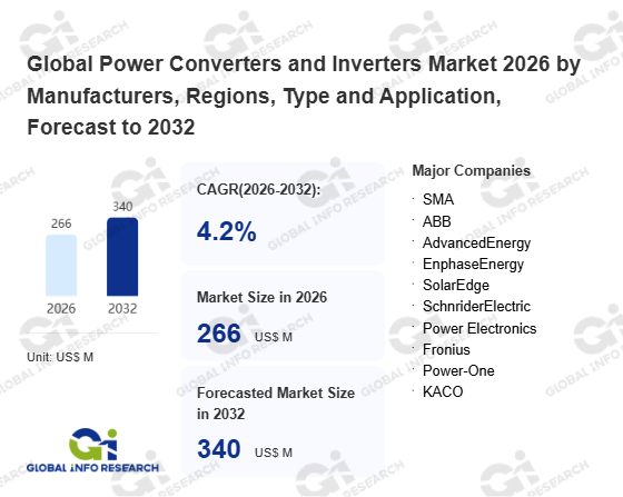 Global Info Research has recently published "Global Power Converters and Inverters Market 2026 by Manufacturers, Regions, Type and Application, Forecast to 2032". This report systematically analyzes the global Power Converters and Inverters market, providing multi-dimensional insights through type (12 VDC Input Voltage Inverter、 24 and 48 VDC Input Voltage Inverter、 200 To 400 VDC Input Voltage Inverter、 300 To 450 VDC Input Voltage Inverter、 Above 450 VDC Input Voltage Inverter), application (DC Power Source Usage、 Uninterruptible Power Supplies、 Electric Motor Speed Control、 Power Grid、 Solar、 Induction Heating、 Others), regional markets, and major manufacturers (SMA、 ABB、 AdvancedEnergy、 EnphaseEnergy、 SolarEdge、 SchnriderElectric、 Power Electronics、 Fronius、 Power-One、 KACO), assessing the market status, trend evolution, and competitive landscape impact from 2021 to 2032.