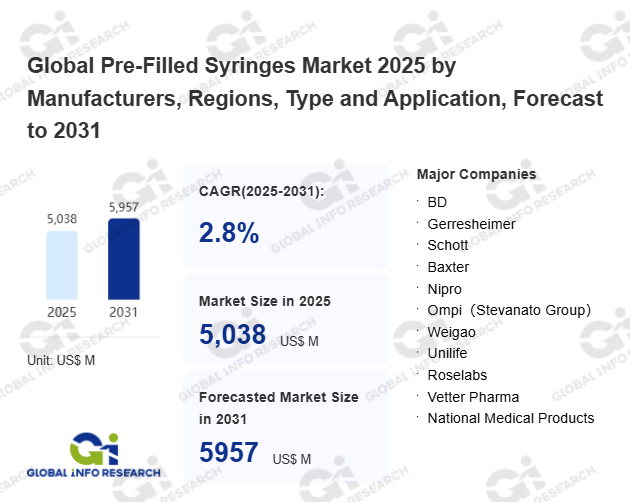 Global Info Research has recently published "Global Pre-Filled Syringes Market 2026 by Manufacturers, Regions, Type and Application, Forecast to 2032". This report systematically analyzes the global Pre-Filled Syringes market, providing multi-dimensional insights through type (Glass Pre-Filled Syringes、 Plastic Pre-Filled Syringes), application (Vaccines、 Monoclonal Antibodies), regional markets, and major manufacturers (BD、 Gerresheimer、 Schott、 Baxter、 Nipro、 Ompi(Stevanato Group)、 Weigao、 Unilife、 Roselabs、 Vetter Pharma、 National Medical Products、 Robert Bosch GmbH、 Owen Mumford、 Ypsomed、 SHL Group、 Bespak、 ROVI CM、 Terumo、 Taisei Kako Co.、 ARTE CORPORATION), assessing the market status, trend evolution, and competitive landscape impact from 2021 to 2032.