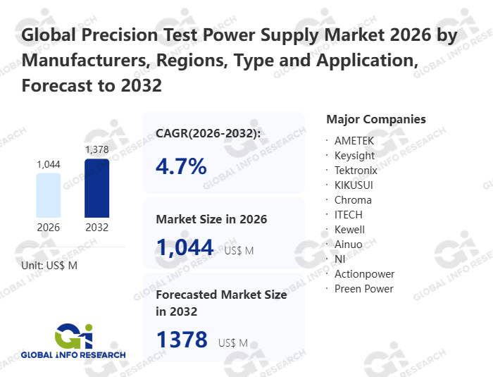 Global Info Research has recently published "Global Precision Test Power Supply Market 2026 by Manufacturers, Regions, Type and Application, Forecast to 2032". This report systematically analyzes the global Precision Test Power Supply market, providing multi-dimensional insights through type (Low Power Test Power Sources (0.5kW ~ 35kW)、 High Power Test Power Sources (40kW ~ 2000kW)), application (New Energy Power Generation、 Electric Vehicles、 Electronics and Semiconductors、 Aerospace、 Rail Transportation、 Others), regional markets, and major manufacturers (AMETEK、 Keysight、 Tektronix、 KIKUSUI、 Chroma、 ITECH、 Kewell、 Ainuo、 NI、 Actionpower、 Preen Power、 Wocen Power、 Nebula、 Digatron、 Pacific Power Source、 Advanced Energy、 Delta Elektronika、 ANDRITZ Bitrode), assessing the market status, trend evolution, and competitive landscape impact from 2021 to 2032.
