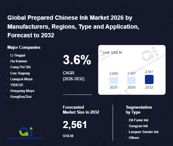 Global Info Research has recently published "Global Prepared Chinese Ink Market 2026 by Manufacturers, Regions, Type and Application, Forecast to 2032". This report systematically analyzes the global Prepared Chinese Ink market, providing multi-dimensional insights through type (Oil Fume Ink、 Songyan Ink、 Lacquer Smoke Ink、 Others), application (Write、 Painting、 Officinal、 Others), regional markets, and major manufacturers (Li Tinggui、 Hu Kaiwen、 Cang Pei Shi、 Cao Sugong、 Liangcai Moye、 YIDEGE、 Hongxing Moye、 RongBaoZhai、 Ostrich-ink、 Simbalion、 Zifangzhai), assessing the market status, trend evolution, and competitive landscape impact from 2021 to 2032.