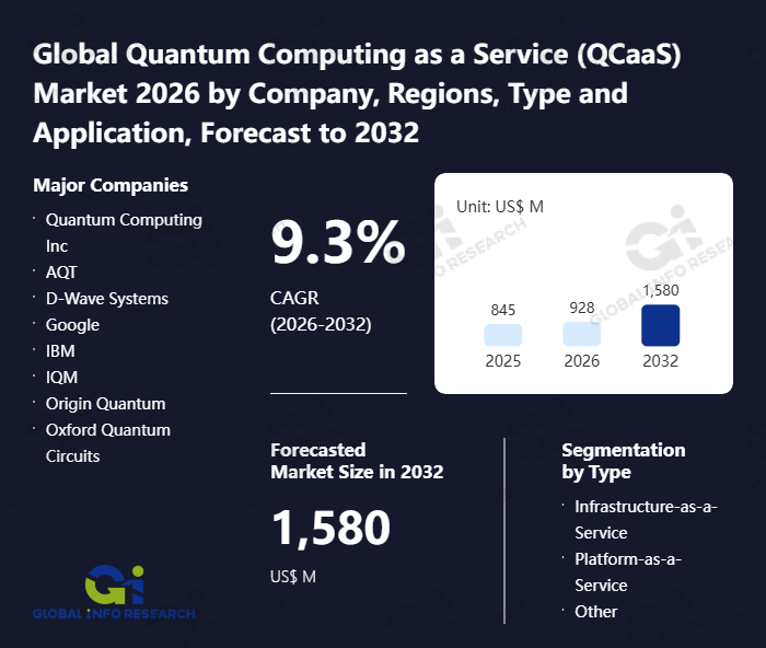 Global Info Research has recently published "Global Quantum Computing as a Service (QCaaS) Market 2026 by Manufacturers, Regions, Type and Application, Forecast to 2032". This report systematically analyzes the global Quantum Computing as a Service (QCaaS) market, providing multi-dimensional insights through type (Infrastructure-as-a-Service、 Platform-as-a-Service、 Other), application (Commercial QCaaS Providers、 Academic and Research QCaaS Providers、 Governmental QCaaS Providers), regional markets, and major manufacturers (Quantum Computing Inc、 AQT、 D-Wave Systems、 Google、 IBM、 IQM、 Origin Quantum、 Oxford Quantum Circuits、 IonQ、 Xanadu、 Qilimanjaro Quantum Tech、 Quantinuum、 QuantumCTek、 Microsoft、 Rigetti Computing、 Amazon Web Services (AWS)), assessing the market status, trend evolution, and competitive landscape impact from 2021 to 2032.