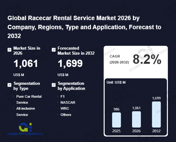 Global Info Research has recently published "Global Racecar Rental Service Market 2026 by Manufacturers, Regions, Type and Application, Forecast to 2032". This report systematically analyzes the current status, future trends (2021-2032), and competitive landscape of the global Racecar Rental Service market. It provides a quantitative analysis from the perspectives of type (Pure Car Rental Service、 All-inclusive Service), application (F1、 NASCAR、 WRC、 Others), regional markets, and major manufacturers (RaceAway、 Ringfreaks、 FARA USA、 Lang Racing、 Kaizen Autosport、 FastLane、 Xtreme Xperience、 Esses Racing、 RSRNurburg、 RaceCarRental、 Jaco's Paddock、 Track-Speed、 Rent4Ring、 Driver61、 RingTaxi、 RMA Track Days、 Trackschool、 RSRSpa、 Nürblife、 Corsa Crew、 SW Racecar、 JMC Racing、 Elite Autosport、 want2race、 Exotics Racing), comprehensively assessing market opportunities and competitive dynamics.