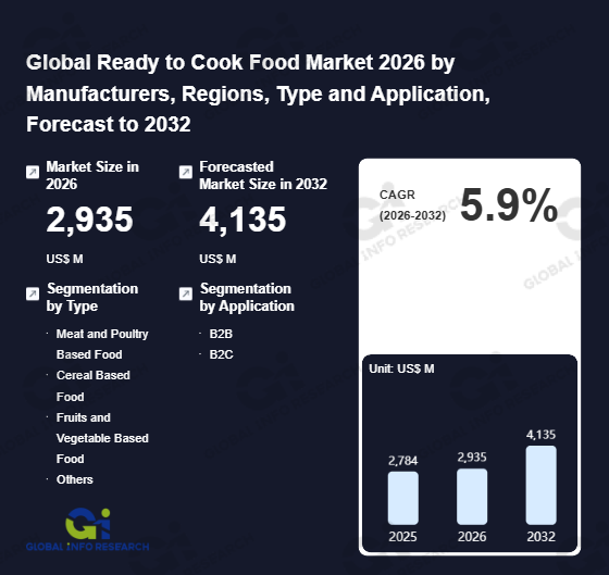 Global Info Research has recently published "Global Ready to Cook Food Market 2026 by Manufacturers, Regions, Type and Application, Forecast to 2032". This report systematically analyzes the current status, future trends (2021-2032), and competitive landscape of the global Ready to Cook Food market. It provides a quantitative analysis from the perspectives of type (Meat and Poultry Based Food、 Cereal Based Food、 Fruits and Vegetable Based Food、 Others), application (B2B、 B2C), regional markets, and major manufacturers (MTR Foods、 Gits、 Kohinoor、 Nevil Foods、 McCain Foods (India)、 Prabhat Poultry、 DEEPTHI FOODS AND FORMULATIONS、 Godrej Tyson Foods、 Nestle (Maggi)、 ITC India、 General Mills、 ADF Foods、 Haldiram), comprehensively assessing market opportunities and competitive dynamics.
