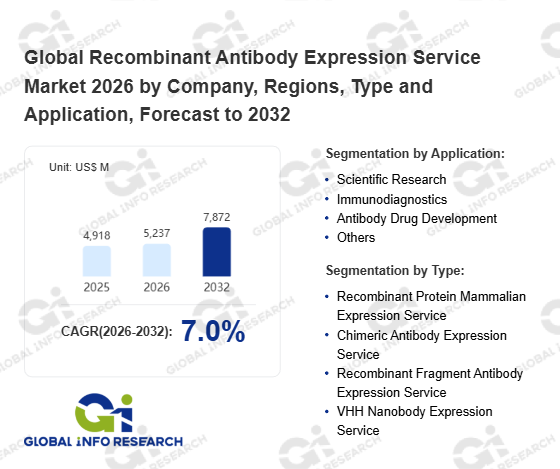 Global Info Research has recently published "Global Recombinant Antibody Expression Service Market 2026 by Manufacturers, Regions, Type and Application, Forecast to 2032". This report systematically analyzes the current status, future trends (2021-2032), and competitive landscape of the global Recombinant Antibody Expression Service market. It provides a quantitative analysis from the perspectives of type (Recombinant Protein Mammalian Expression Service、 Chimeric Antibody Expression Service、 Recombinant Fragment Antibody Expression Service、 VHH Nanobody Expression Service), application (Scientific Research、 Immunodiagnostics、 Antibody Drug Development、 Others), regional markets, and major manufacturers (GenScript Biotech、 Creative Biolabs、 Thermo Fisher Scientific、 Bio-Rad Laboratories、 Sino Biological、 ProMab Biotechnologies、 LakePharma(Curia)、 Profacgen、 Atlas Antibodies、 Absolute Antibody、 ProteoGenix、 Rockland Immunochemicals、 Proteintech、 RayBiotech、 BioLegend、 Agilent Technologies、 Novus Biologicals、 OriGene Technologies、 ACROBiosystems、 Fitzgerald Industries(Biosynth)、 Azenta Life Sciences、 R&D Systems、 Abnova、 WuXi Biologics、 Biointron Biological、 Detai Bio-Tech、 cusabio、 FITGENE、 GentleGen、 TekBiotech), comprehensively assessing market opportunities and competitive dynamics.