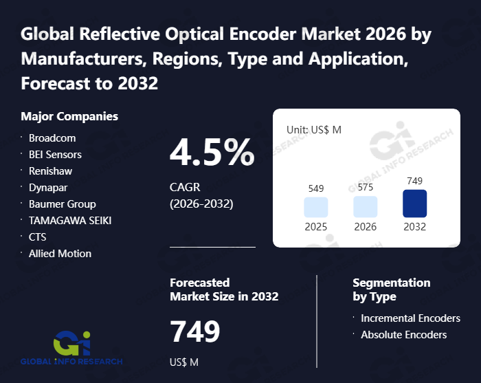 Global Info Research has recently published "Global Reflective Optical Encoder Market 2026 by Manufacturers, Regions, Type and Application, Forecast to 2032". This report systematically analyzes the global Reflective Optical Encoder market, providing multi-dimensional insights through type (Incremental Encoders、 Absolute Encoders), application (Miniature Motors and Actuators、 Industrial Automation Robots、 Medical Devices、 Other), regional markets, and major manufacturers (Broadcom、 BEI Sensors、 Renishaw、 Dynapar、 Baumer Group、 TAMAGAWA SEIKI、 CTS、 Allied Motion、 EPC、 US Digital、 CUI、 OMRON Corporation、 HEIDENHAIN、 Bourns、 Grayhill、 Gurley Precision Instruments、 HONEYWELL INTERNATIONAL INC、 Graduate Honest Sensor Corp、 HONTKO、 Yuheng Optics、 Inovance Technology), assessing the market status, trend evolution, and competitive landscape impact from 2021 to 2032.