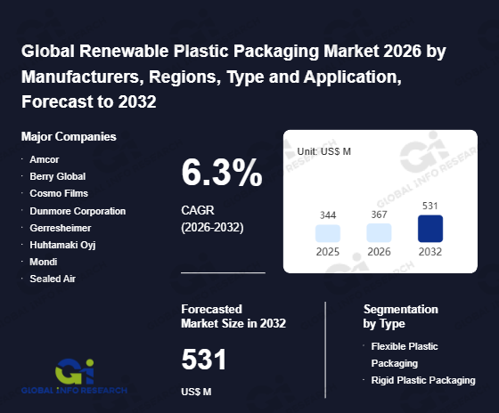Global Info Research has recently published "Global Renewable Plastic Packaging Market 2026 by Manufacturers, Regions, Type and Application, Forecast to 2032". This report systematically analyzes the current status, future trends (2021-2032), and competitive landscape of the global Renewable Plastic Packaging market. It provides a quantitative analysis from the perspectives of type (Flexible Plastic Packaging、 Rigid Plastic Packaging), application (Consumer Goods、 Textiles、 Agriculture & Horticulture、 Automotive & Transport、 Others), regional markets, and major manufacturers (Amcor、 Berry Global、 Cosmo Films、 Dunmore Corporation、 Gerresheimer、 Huhtamaki Oyj、 Mondi、 Sealed Air、 Sonoco、 Polyplex、 Uflex Ltd、 Frapak Packaging、 Amerplast、 Greiner Packaging、 ALPLA、 Plastipak Holdings、 Graham Packaging、 Avantpack、 Biowrap、 NextGen Bioplastics、 Plantic Technologies), comprehensively assessing market opportunities and competitive dynamics.