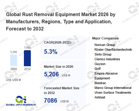 Global Info Research has recently published "Global Rust Removal Equipment Market 2026 by Manufacturers, Regions, Type and Application, Forecast to 2032". This report systematically analyzes the global Rust Removal Equipment market, providing multi-dimensional insights through type (Shot Blasting Equipment、 Sand Blasting Equipment、 Laser Rust Removal Equipment、 Chemical Rust Removal Equipment、 Electrolytic Rust Removal Equipment), application (Steel Structure Processing、 Shipbuilding & Offshore、 Automotive & Rail Transit、 Engineering Machinery、 Energy Equipment、 Others), regional markets, and major manufacturers (Norican Group、 Rösler Oberflächentechnik、 Sinto Group、 Clemco Industries、 Guyson、 Goff、 Empire Abrasive Equipment、 Blastrac、 Marco Group International、 Vixen Surface Treatments、 Airblast、 Axxiom Manufacturing、 Tumblast、 Kärcher Industrial、 Coherent (P-Laser)、 CleanLaser、 Laserax、 Adapt Laser Systems、 Curtiss-Wright), assessing the market status, trend evolution, and competitive landscape impact from 2021 to 2032.