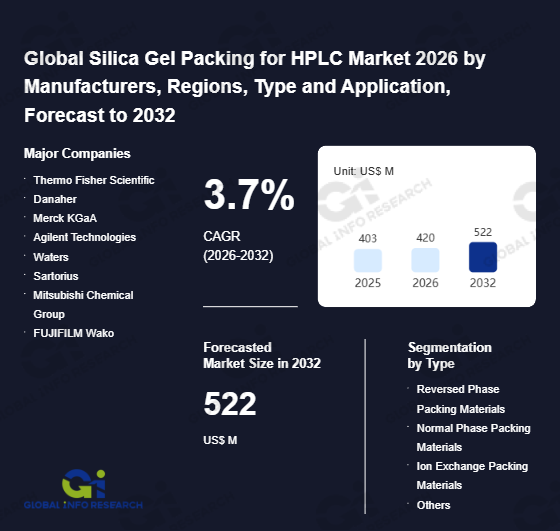 Global Info Research has recently published "Global Silica Gel Packing for HPLC Market 2026 by Manufacturers, Regions, Type and Application, Forecast to 2032". This report systematically analyzes the global Silica Gel Packing for HPLC market, providing multi-dimensional insights through type (Reversed Phase Packing Materials、 Normal Phase Packing Materials、 Ion Exchange Packing Materials、 Others), application (Biopharmaceutical、 Scientific Research), regional markets, and major manufacturers (Thermo Fisher Scientific、 Danaher、 Merck KGaA、 Agilent Technologies、 Waters、 Sartorius、 Mitsubishi Chemical Group、 FUJIFILM Wako、 Repligen、 Bio-Rad Laboratories、 YMC、 Shimadzu、 Tosoh、 Daicel、 Osaka Soda、 NanoMicro Tech、 Suzhou Sepax Technologies、 Kaneka、 Gltechno Holdings), assessing the market status, trend evolution, and competitive landscape impact from 2021 to 2032.