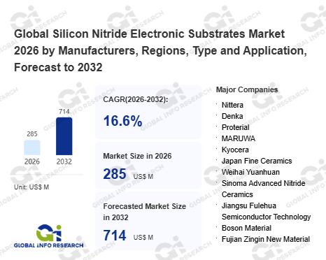 Global Info Research has recently published "Global Silicon Nitride Electronic Substrates Market 2026 by Manufacturers, Regions, Type and Application, Forecast to 2032". This report systematically analyzes the global Silicon Nitride Electronic Substrates market, providing multi-dimensional insights through type (0.32mm SiN Substrate、 0.25mm SiN Substrate), application (Automotive、 Rail Transport、 PV & Wind Power、 Military & Aerospace、 Industrial、 Others), regional markets, and major manufacturers (Nittera、 Denka、 Proterial、 MARUWA、 Kyocera、 Japan Fine Ceramics、 Weihai Yuanhuan、 Sinoma Advanced Nitride Ceramics、 Jiangsu Fulehua Semiconductor Technology、 Boson Material、 Fujian Zingin New Material、 Ascendus New Material、 Zhejiang Polyhedron New Material、 Zhengtian New Material), assessing the market status, trend evolution, and competitive landscape impact from 2021 to 2032.