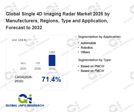 Global Info Research has recently published "Global Single 4D Imaging Radar Market 2026 by Manufacturers, Regions, Type and Application, Forecast to 2032". This report systematically analyzes the global Single 4D Imaging Radar market, providing multi-dimensional insights through type (Based on PMCW、 Based on FMCW), application (Automobile、 Robotics、 Others), regional markets, and major manufacturers (Arbe Robotics、 Oculii、 Unhder、 HUAWEI、 Mobileeye、 RFIsee), assessing the market status, trend evolution, and competitive landscape impact from 2021 to 2032.