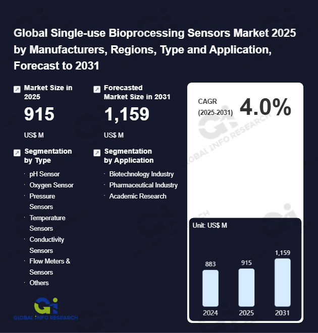 Global Info Research has recently published "Global Single-use Bioprocessing Sensors Market 2026 by Manufacturers, Regions, Type and Application, Forecast to 2032". This report systematically analyzes the global Single-use Bioprocessing Sensors market, providing multi-dimensional insights through type (pH Sensor、 Oxygen Sensor、 Pressure Sensors、 Temperature Sensors、 Conductivity Sensors、 Flow Meters & Sensors、 Others), application (Biotechnology Industry、 Pharmaceutical Industry、 Academic Research), regional markets, and major manufacturers (Thermo Fisher Scientific、 Merck Millipore、 Sartorius AG、 Danaher Corporation、 PreSens Precision Sensing GmbH、 ABEC、 Hamilton Company、 PendoTECH LLC、 Equflow、 Parker Hannifin Corporation、 Malema Engineering Corporation、 Dover Corporation、 Broadley-James Corporation、 High Purity New England, Inc.、 Cole-Parmer Instrument Company, LLC.、 ESI Ultrapure), assessing the market status, trend evolution, and competitive landscape impact from 2021 to 2032.