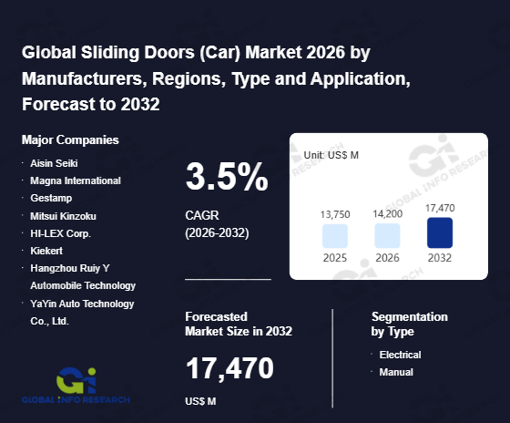Global Info Research has recently published "Global Sliding Doors (Car) Market 2026 by Manufacturers, Regions, Type and Application, Forecast to 2032". This report systematically analyzes the current status, future trends (2021-2032), and competitive landscape of the global Sliding Doors (Car) market. It provides a quantitative analysis from the perspectives of type (Electrical、 Manual), application (Passenger Cars、 Commercial Vehicles), regional markets, and major manufacturers (Aisin Seiki、 Magna International、 Gestamp、 Mitsui Kinzoku、 HI-LEX Corp.、 Kiekert、 Hangzhou Ruiy Y Automobile Technology、 YaYin Auto Technology Co., Ltd.、 Shenzhen Xingjialin Electronic Technology), comprehensively assessing market opportunities and competitive dynamics.