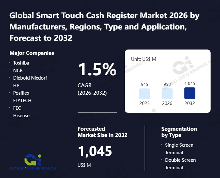 Global Info Research has recently published "Global Smart Touch Cash Register Market 2026 by Manufacturers, Regions, Type and Application, Forecast to 2032". This report systematically analyzes the global Smart Touch Cash Register market, providing multi-dimensional insights through type (Single Screen Terminal、 Double Screen Terminal), application (Retail Industry、 Food Industry、 Game Entertainment、 Other), regional markets, and major manufacturers (Toshiba、 NCR、 Diebold Nixdorf、 HP、 Posiflex、 FLYTECH、 FEC、 Hisense、 Partner、 Fujitsu、 NEC、 WINTEC、 Elo Touch、 Ejeton、 Zonerich), assessing the market status, trend evolution, and competitive landscape impact from 2021 to 2032.