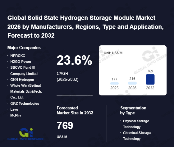 Global Info Research has recently published "Global Solid State Hydrogen Storage Module Market 2026 by Manufacturers, Regions, Type and Application, Forecast to 2032". This report systematically analyzes the current status, future trends (2021-2032), and competitive landscape of the global Solid State Hydrogen Storage Module market. It provides a quantitative analysis from the perspectives of type (Physical Storage Technology、 Chemical Storage Technology), application (Automobile、 Communication Base Station、 Wind Power Photovoltaic、 Chemical、 Others), regional markets, and major manufacturers (NPROXX、 H2GO Power、 SBCVC Fund III Company Limited、 GKN Hydrogen、 Whole Win (Beijing) Materials Sci.&Tech. Co., Ltd.、 GRZ Technologies、 Lavo、 McPhy、 METHYDOR SRL、 Etorq Investment Company Limited、 Antai Chuangming Advanced Energy Materials Research Institute Co., Ltd.、 Hystorsys、 Plasma Kinetics、 AE&M、 JOMI LEMAN、 MINCATEC ENERGY、 China Youyan Technology Group Co., Ltd.、 Sinonesium Time Technology Co., Ltd.、 Hangzhou Jingxiao Technology Co., Ltd.), comprehensively assessing market opportunities and competitive dynamics.