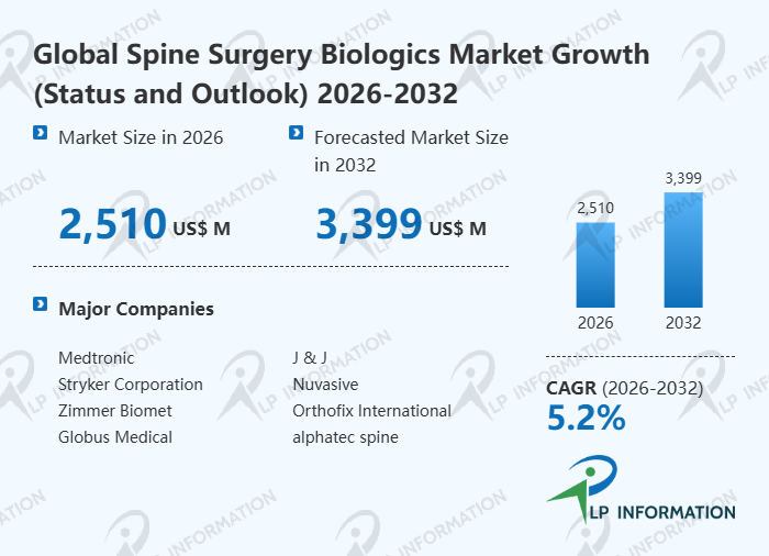 LP Information's latest "Global Spine Surgery Biologics Market Growth 2026-2032" aims to provide a comprehensive assessment of the industry's current status, competitive landscape, future trends, and opportunities. Spine Surgery Biologics report presents readers with a comprehensive, systematic, and forward-looking global keyword market analysis blueprint through a three-dimensional analytical framework: "Data Quantification (Size, Growth Rate, Market Share) + Structural Analysis (Products, Applications, Regions, Competition) + In-Depth Insights (Costs, Channels, Trends)."