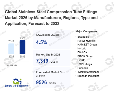 Global Info Research has recently published "Global Stainless Steel Compression Tube Fittings Market 2026 by Manufacturers, Regions, Type and Application, Forecast to 2032". This report systematically analyzes the global Stainless Steel Compression Tube Fittings market, providing multi-dimensional insights through type (Single Ferrule Fitting、 Double Ferrule Fitting), application (Infrastructure、 Energy & Power、 Semiconductor & Electronics、 Chemical Processing、 Oil & Gas、 Others), regional markets, and major manufacturers (Swagelok、 Parker Hannifin、 HAM-LET Group、 Hy-Lok、 DK-LOK、 FITOK Group、 HOKE、 SSP Fittings、 Superlok、 Tylok International、 Brennan Industries、 Gyrolok、 Vee-Lok、 Fujikin、 GEMÜ Group、 Dockweiler、 Ultra Clean Technology (UCT)、 SMC Corporation、 Eaton Aeroquip), assessing the market status, trend evolution, and competitive landscape impact from 2021 to 2032.