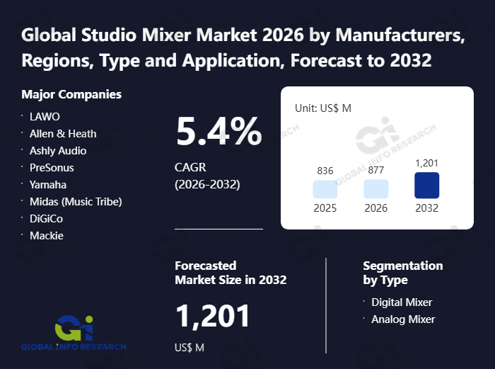 Global Info Research has recently published "Global Studio Mixer Market 2026 by Manufacturers, Regions, Type and Application, Forecast to 2032". This report systematically analyzes the current status, future trends (2021-2032), and competitive landscape of the global Studio Mixer market. It provides a quantitative analysis from the perspectives of type (Digital Mixer、 Analog Mixer), application (Recording Studio、 Public Address System、 Post-Production、 Others), regional markets, and major manufacturers (LAWO、 Allen & Heath、 Ashly Audio、 PreSonus、 Yamaha、 Midas (Music Tribe)、 DiGiCo、 Mackie、 Tascam、 Soundcraft、 Phonic、 Behringer、 Alesis、 Denon DJ、 Samson Technologies、 Numark、 Aviom、 Ecler、 AEQ、 Omnitronic、 Tamura、 RCF SPA), comprehensively assessing market opportunities and competitive dynamics.