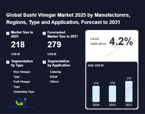 Global Info Research has recently published "Global Sushi Vinegar Market 2026 by Manufacturers, Regions, Type and Application, Forecast to 2032". This report systematically analyzes the global Sushi Vinegar market, providing multi-dimensional insights through type (Rice Vinegar Type、 Fruit Vinegar Type、 Seasoning Type), application (Catering、 Retail、 Others), regional markets, and major manufacturers (Mizkan、 Fundodai、 Shinho、 HADAY、 Qianhe、 Kewpie、 Kikkoman、 Daesang、 Yamasa、 Otafuku), assessing the market status, trend evolution, and competitive landscape impact from 2021 to 2032.