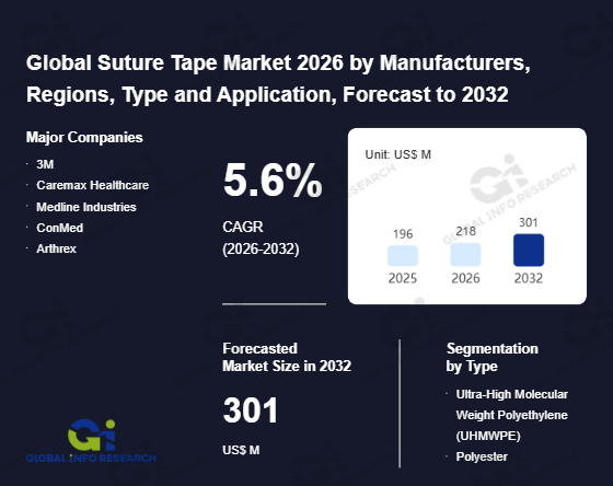 Global Info Research has recently published "Global Suture Tape Market 2026 by Manufacturers, Regions, Type and Application, Forecast to 2032". This report systematically analyzes the current status, future trends (2021-2032), and competitive landscape of the global Suture Tape market. It provides a quantitative analysis from the perspectives of type (Ultra-High Molecular Weight Polyethylene (UHMWPE)、 Polyester), application (Hospital、 Clinic、 Ambulatory Surgical Center、 Others), regional markets, and major manufacturers (3M、 Caremax Healthcare、 Medline Industries、 ConMed、 Arthrex), comprehensively assessing market opportunities and competitive dynamics.