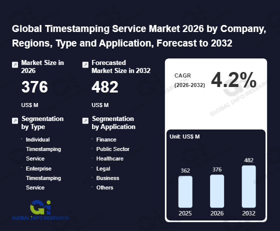 Global Info Research has recently published "Global Timestamping Service Market 2026 by Manufacturers, Regions, Type and Application, Forecast to 2032". This report systematically analyzes the global Timestamping Service market, providing multi-dimensional insights through type (Individual Timestamping Service、 Enterprise Timestamping Service), application (Finance、 Public Sector、 Healthcare、 Legal、 Business、 Others), regional markets, and major manufacturers (GlobalSign、 HID Global Corporation、 SwissSign、 Utimaco、 Luxtrust、 PrimeKey、 eMudhra、 Entrust、 Mediacert、 Enigio、 SK ID Solutions、 WoSign、 Datasure、 EDICOM、 Istec), assessing the market status, trend evolution, and competitive landscape impact from 2021 to 2032.