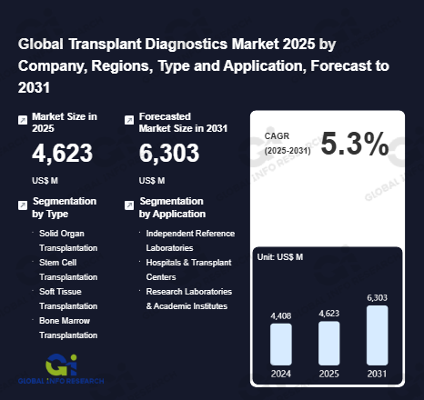 Global Info Research has recently published "Global Transplant Diagnostics Market 2026 by Manufacturers, Regions, Type and Application, Forecast to 2032". This report systematically analyzes the global Transplant Diagnostics market, providing multi-dimensional insights through type (Solid Organ Transplantation、 Stem Cell Transplantation、 Soft Tissue Transplantation、 Bone Marrow Transplantation), application (Independent Reference Laboratories、 Hospitals & Transplant Centers、 Research Laboratories & Academic Institutes), regional markets, and major manufacturers (BD、 Biofortuna、 Biomérieux SA、 Bio-Rad Laboratories、 Caredx、 F. Hoffman-La Roche、 Gendx、 Hologic、 Illumina、 Immucor、 Luminex、 Merck KGaA、 Omixon、 Qiagen、 Thermo Fisher Scientific), assessing the market status, trend evolution, and competitive landscape impact from 2021 to 2032.