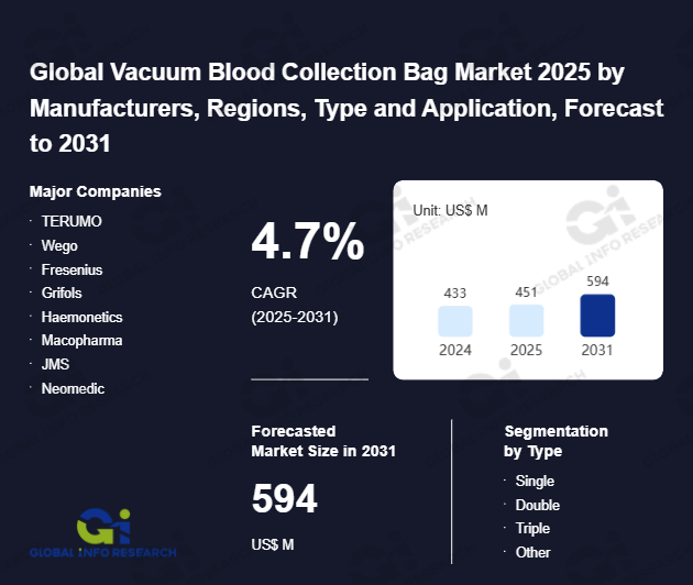 Global Info Research has recently published "Global Vacuum Blood Collection Bag Market 2026 by Manufacturers, Regions, Type and Application, Forecast to 2032". This report systematically analyzes the current status, future trends (2021-2032), and competitive landscape of the global Vacuum Blood Collection Bag market. It provides a quantitative analysis from the perspectives of type (Single、 Double、 Triple、 Other), application (Blood Banks、 Hospital、 Other), regional markets, and major manufacturers (TERUMO、 Wego、 Fresenius、 Grifols、 Haemonetics、 Macopharma、 JMS、 Neomedic、 STT、 AdvaCare), comprehensively assessing market opportunities and competitive dynamics.