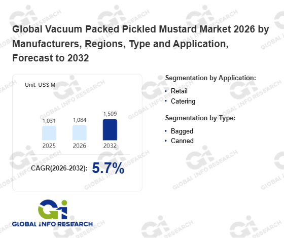 Global Info Research has recently published "Global Vacuum Packed Pickled Mustard Market 2026 by Manufacturers, Regions, Type and Application, Forecast to 2032". This report systematically analyzes the global Vacuum Packed Pickled Mustard market, providing multi-dimensional insights through type (Bagged、 Canned), application (Retail、 Catering), regional markets, and major manufacturers (Chongqing Fuling Zhacai Group、 Chongqing Fish Well Preserved Vegetable、 BEIJING LIBIJU FOOD、 Sichuan Fansaoguang Food、 Sichuan Weijute Food、 Chuannan Brewery、 Jixiangju Food、 Zhejiang Beidefu、 Zhejiang Xieqiao), assessing the market status, trend evolution, and competitive landscape impact from 2021 to 2032.