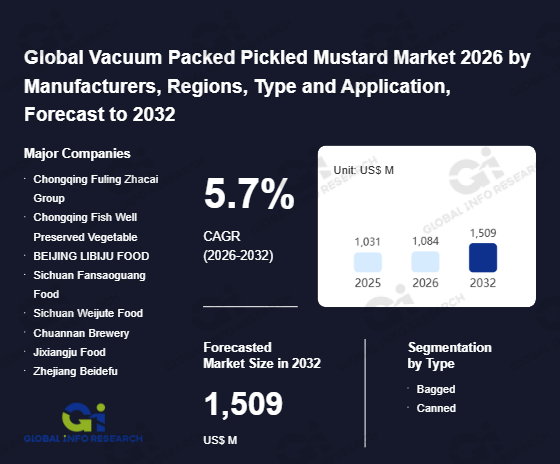 Global Info Research has recently published "Global Vacuum Packed Pickled Mustard Market 2026 by Manufacturers, Regions, Type and Application, Forecast to 2032". This report systematically analyzes the current status, future trends (2021-2032), and competitive landscape of the global Vacuum Packed Pickled Mustard market. It provides a quantitative analysis from the perspectives of type (Bagged、 Canned), application (Retail、 Catering), regional markets, and major manufacturers (Chongqing Fuling Zhacai Group、 Chongqing Fish Well Preserved Vegetable、 BEIJING LIBIJU FOOD、 Sichuan Fansaoguang Food、 Sichuan Weijute Food、 Chuannan Brewery、 Jixiangju Food、 Zhejiang Beidefu、 Zhejiang Xieqiao), comprehensively assessing market opportunities and competitive dynamics.