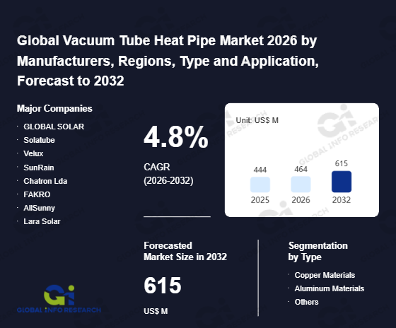 Global Info Research has recently published "Global Vacuum Tube Heat Pipe Market 2026 by Manufacturers, Regions, Type and Application, Forecast to 2032". This report systematically analyzes the current status, future trends (2021-2032), and competitive landscape of the global Vacuum Tube Heat Pipe market. It provides a quantitative analysis from the perspectives of type (Copper Materials、 Aluminum Materials、 Others), application (Residential Users、 Commercial and Industrial Facilities、 Agriculture and Greenhouses), regional markets, and major manufacturers (GLOBAL SOLAR、 Solatube、 Velux、 SunRain、 Chatron Lda、 FAKRO、 AllSunny、 Lara Solar、 Assolar、 Solarsan、 Apricus、 Ritter Solar GmbH、 HYDROSOL、 Centrometal、 Northern Lights Solar Solutions、 Himin Solar Energy、 Sunshore Solar Energy、 Zentek Energy、 Junbro、 Jiaxing Jinyi Solar Energy Technology), comprehensively assessing market opportunities and competitive dynamics.