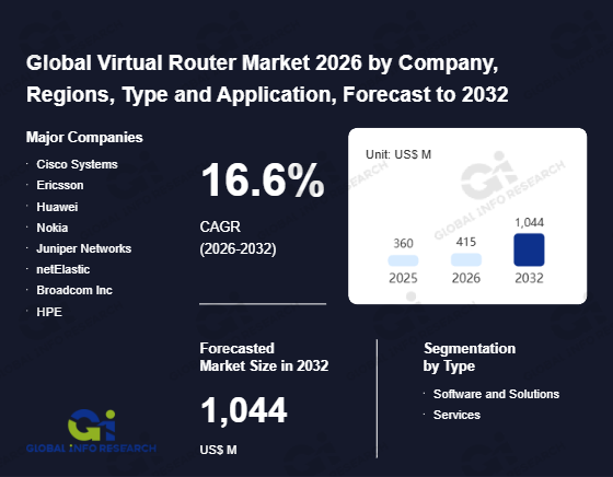 Global Info Research has recently published "Global Virtual Router Market 2026 by Manufacturers, Regions, Type and Application, Forecast to 2032". This report systematically analyzes the current status, future trends (2021-2032), and competitive landscape of the global Virtual Router market. It provides a quantitative analysis from the perspectives of type (Software and Solutions、 Services), application (Service Providers、 Enterprises), regional markets, and major manufacturers (Cisco Systems、 Ericsson、 Huawei、 Nokia、 Juniper Networks、 netElastic、 Broadcom Inc、 HPE、 Arista Networks、 ZTE、 6WIND S.A.、 128 Technology、 TIME dotCom Bhd、 Inventum、 DriveNets Ltd.、 Connectify、 Netronome、 Softonic、 WinHotSpot), comprehensively assessing market opportunities and competitive dynamics.