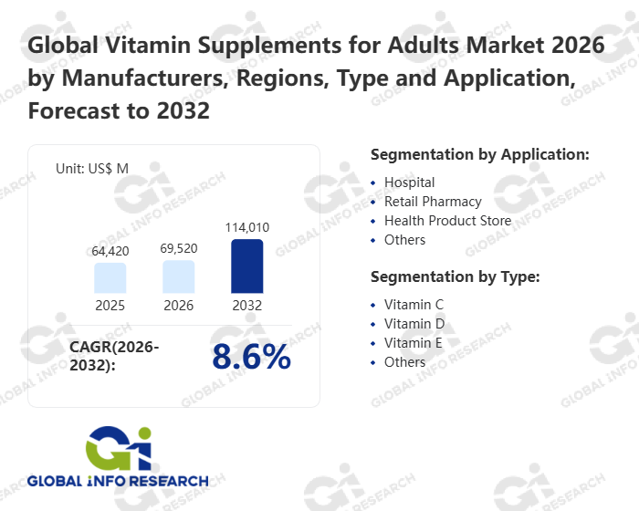 Global Info Research has recently published "Global Vitamin Supplements for Adults Market 2026 by Manufacturers, Regions, Type and Application, Forecast to 2032". This report systematically analyzes the global Vitamin Supplements for Adults market, providing multi-dimensional insights through type (Vitamin C、 Vitamin D、 Vitamin E、 Others), application (Hospital、 Retail Pharmacy、 Health Product Store、 Others), regional markets, and major manufacturers (GNC、 Natrol、 DSM、 Vibrant Health、 BASF、 Zhejiang NHU、 Croda、 CSPC Pharma、 EPAX、 Adisseo、 Zhejiang Medicine、 Raisio Group、 Northeast Pharma、 Shandong Luwei、 Allied Biotech、 Cargill、 Anhui Tiger、 Shandong Tianli、 Kerry、 Dohler、 Kemin、 Chenguang Biotech、 FMC、 Chr. Hansen、 Excelvite、 DDW), assessing the market status, trend evolution, and competitive landscape impact from 2021 to 2032.