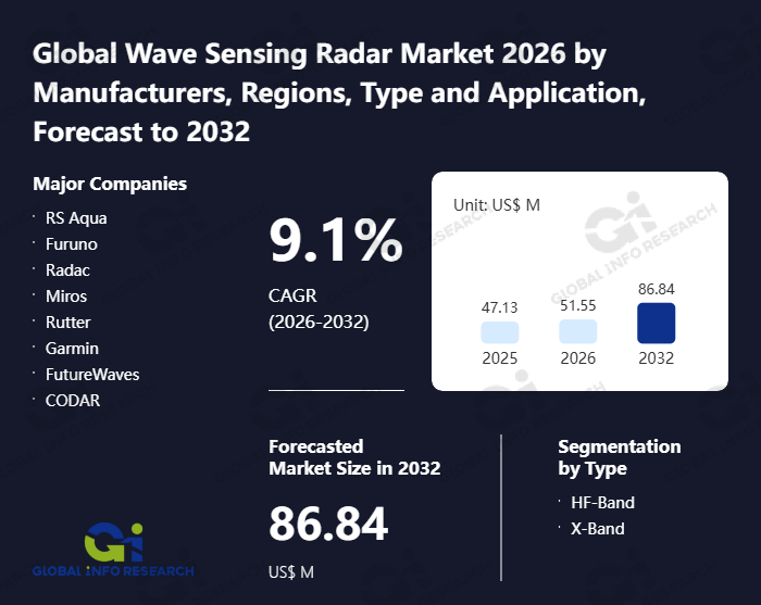 Global Info Research has recently published "Global Wave Sensing Radar Market 2026 by Manufacturers, Regions, Type and Application, Forecast to 2032". This report systematically analyzes the current status, future trends (2021-2032), and competitive landscape of the global Wave Sensing Radar market. It provides a quantitative analysis from the perspectives of type (HF-Band、 X-Band), application (Merchant Ships、 Offshore Platforms、 Land-Based Observation Stations、 Others), regional markets, and major manufacturers (RS Aqua、 Furuno、 Radac、 Miros、 Rutter、 Garmin、 FutureWaves、 CODAR、 Raymarine、 Wartsila、 Sperry Marine、 Norwegian Subsea、 OceanWise、 WISE Group、 Obscape、 Helzel、 Kekan Marine Technology、 Vic-Ocean、 Wellmax、 Nortek), comprehensively assessing market opportunities and competitive dynamics.