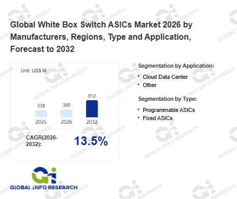 Global Info Research has recently published "Global White Box Switch ASICs Market 2026 by Manufacturers, Regions, Type and Application, Forecast to 2032". This report systematically analyzes the current status, future trends (2021-2032), and competitive landscape of the global White Box Switch ASICs market. It provides a quantitative analysis from the perspectives of type (Programmable ASICs、 Fixed ASICs), application (Cloud Data Center、 Other), regional markets, and major manufacturers (Broadcom、 Marvell、 Barefoot、 Mellanox、 Centec), comprehensively assessing market opportunities and competitive dynamics.