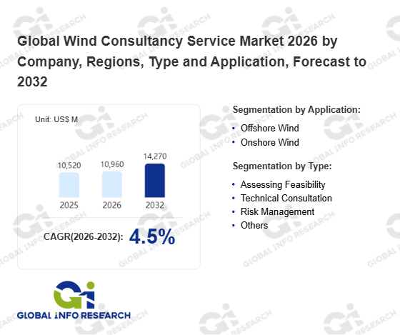 Global Info Research has recently published "Global Wind Consultancy Service Market 2026 by Manufacturers, Regions, Type and Application, Forecast to 2032". This report systematically analyzes the current status, future trends (2021-2032), and competitive landscape of the global Wind Consultancy Service market. It provides a quantitative analysis from the perspectives of type (Assessing Feasibility、 Technical Consultation、 Risk Management、 Others), application (Offshore Wind、 Onshore Wind), regional markets, and major manufacturers (Applus+、 EMD International、 ETC EnergyTConsultant、 UL、 Dulas、 Royal HaskoningDHV、 NORMAWIND、 FCS、 AFRY、 BVG Associates、 Natural Power、 Sweco、 Wind Cluster、 Windtech Consultants、 Kimley-Horn、 LRQA、 Weidmuller、 RINA), comprehensively assessing market opportunities and competitive dynamics.
